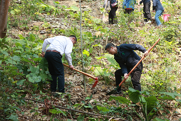 緊接著,由公司技術員和流溪河林場代表分別介紹本次活動植樹的樹種及種植注意事項。植樹現場,小伙伴三五人一組相互配合、揮鍬培土、澆水育苗,齊心協力完成每一道植樹工序。本次義務植樹活動種有桂花、(洋)紫荊、楓香、金絲楠、沉香等5個品種共100余株苗木,為森林公園再添新綠,進一步提升周邊生態景觀。