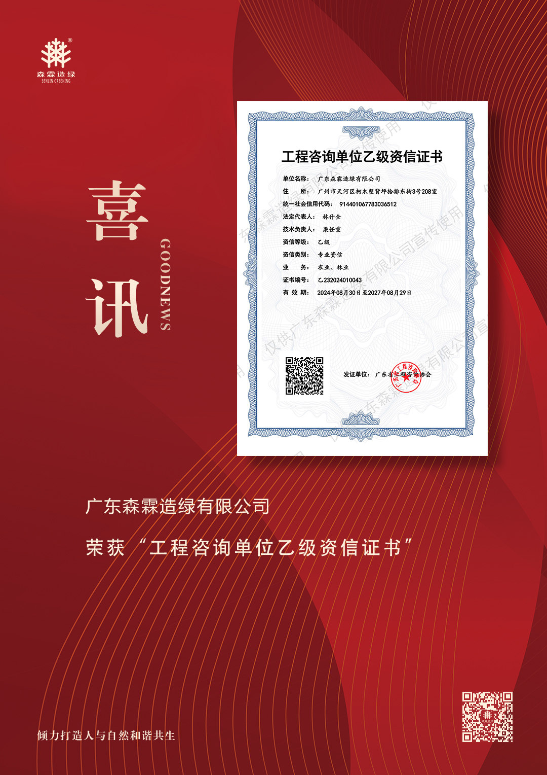 展望未來,森霖造綠將以此為契機,繼續發揮在農林項目工程咨詢領域的專業技術服務優勢,加強全過程工程咨詢服務能力,為廣大客戶提供更全面、專業、優質的工程咨詢服務,為新時代林業生態建設作出更大貢獻。