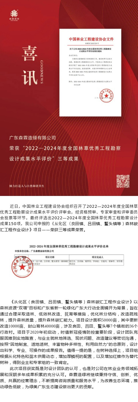 喜訊 | 我公司項目成果榮獲2022—2024年度全國林草優秀工程勘察設計成果水平評價三等成果