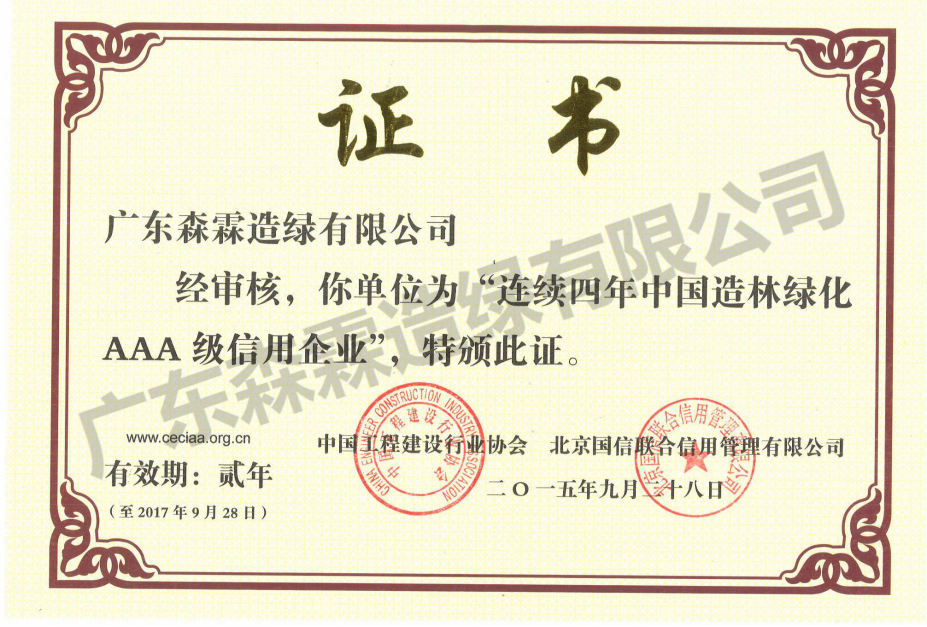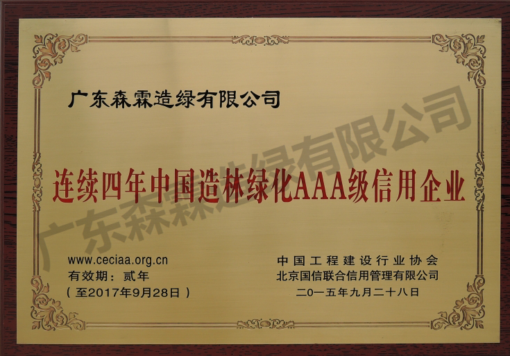 連續(xù)四年中國造林綠化AAA級信用企業(yè)證書