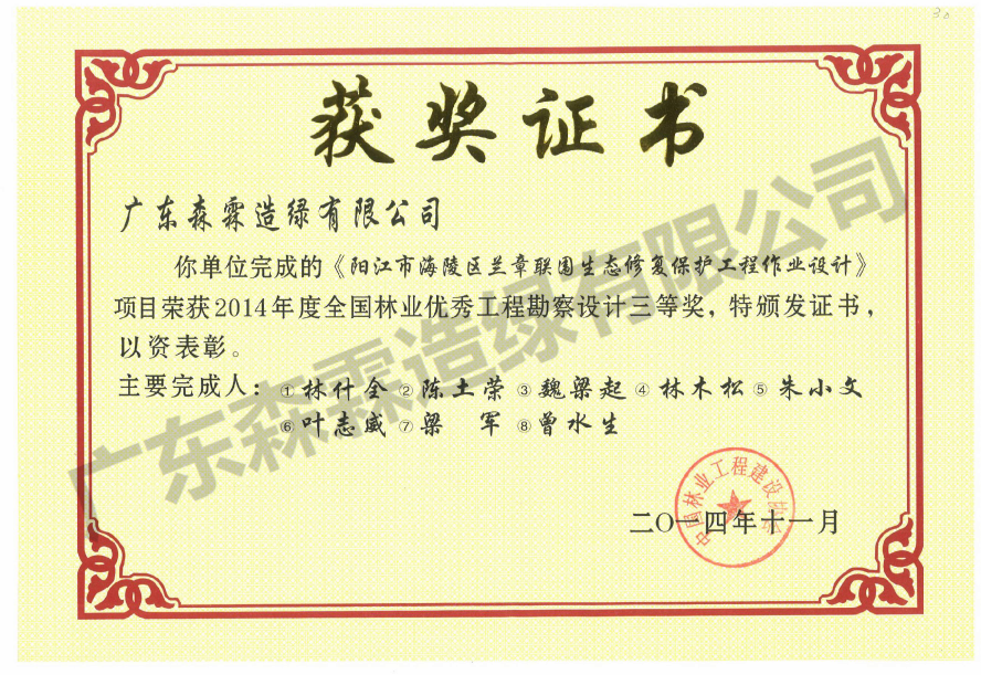 2014年度全國林業優秀工程勘察設計三等獎證書